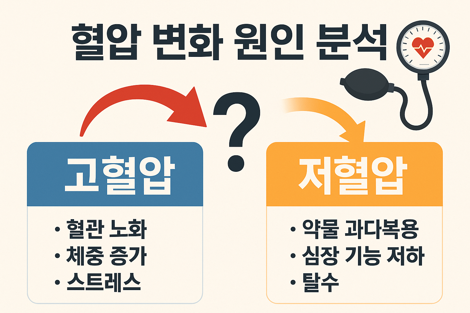 고혈압에서 저혈압으로, 또는 저혈압에서 고혈압으로 바뀌는 경우 그 배경에는 약물, 체중 변화, 식습관, 심장 기능 변화 등이 존재합니다. 정기적인 혈압 체크, 균형 잡힌 식단, 스트레스 관리, 적절한 운동을 통해 혈압의 균형을 유지하는 것이 가장 효과적인 방법입니다.